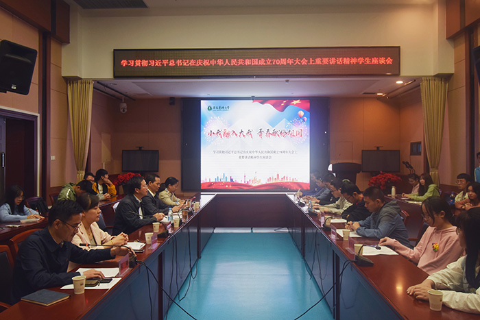 10月12日上午,我校在知行楼一楼会议室召开学习贯彻习近平总书记在庆祝中华人民共和国成立70周年大会上的重要讲话精神学生座谈会。会议传达了习近平总书记在庆祝中华人民共和国成立70周年大会上的重要讲话精神。校党委副书记刘群英出席并讲话。