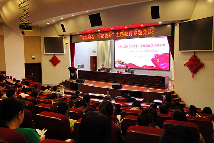 10月15日下午,根据“不忘初心、牢记使命”主题教育部署要求,校党委副书记刘群英以《把握主题教育总要求,争做思政工作好干部》为题,为全校思政干部讲专题党课。省委第十二指导组耿天召、姚勇列席党课。