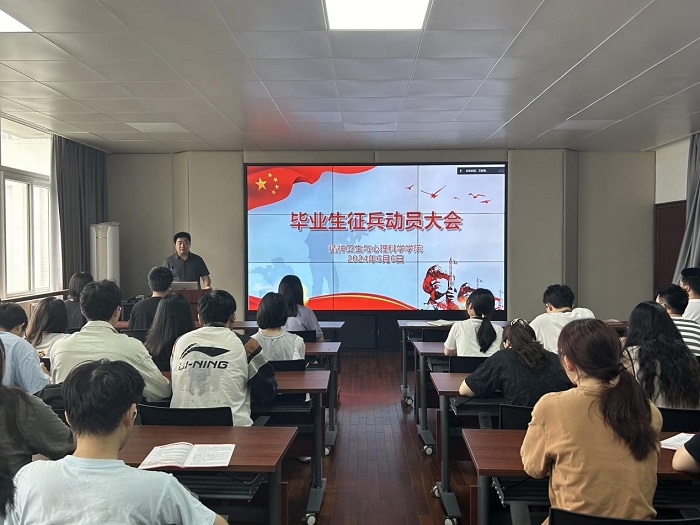 6月6日上午,精神卫生与心理科学学院召开毕业生征兵工作动员会。该院党委书记凌春笋、院党委副书记陶群出席会议,2024届毕业生代表及本科生辅导员参加会议。