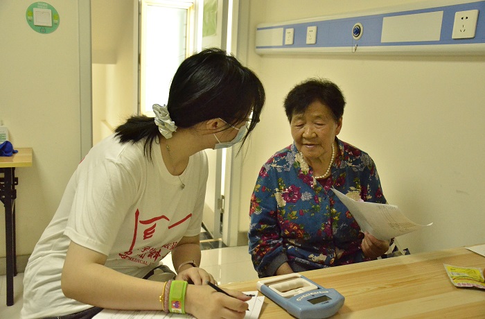 实践队明确分工,在古城台社区卫生服务中心协助医生为社区老人体检,与医生一起有条不紊地为老人们测量骨密度、身高、体重、血压并做好记录。还根据体检结果,结合所学专业知识,面向老年人开展健康宣教和健康咨询活动,向他们普及健康知识,提高健康意识。