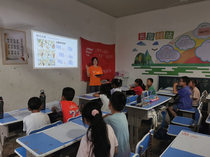 非遗手工课堂,文化浸润童心。实践队前往泾县长园村综合文化服务中心,聚焦“宣纸文化”,为乡村的小朋友们带去了一场别开生面的传统文化探索之旅。课堂上,通过生动讲述、图片展示以及互动问答,队员们向小朋友们介绍了宣纸的生产过程及宣纸文化的时代价值,带领他们一起铺压黄底宣纸、手持纤毫毛笔,感受油墨在纸间流动氤氲的魅力。队员们还为小朋友们送上了自制的宣纸书签、印章等礼物,提升孩子们对中华优秀传统文化的兴趣与热爱,将文化自信“种”在孩子们的心间。