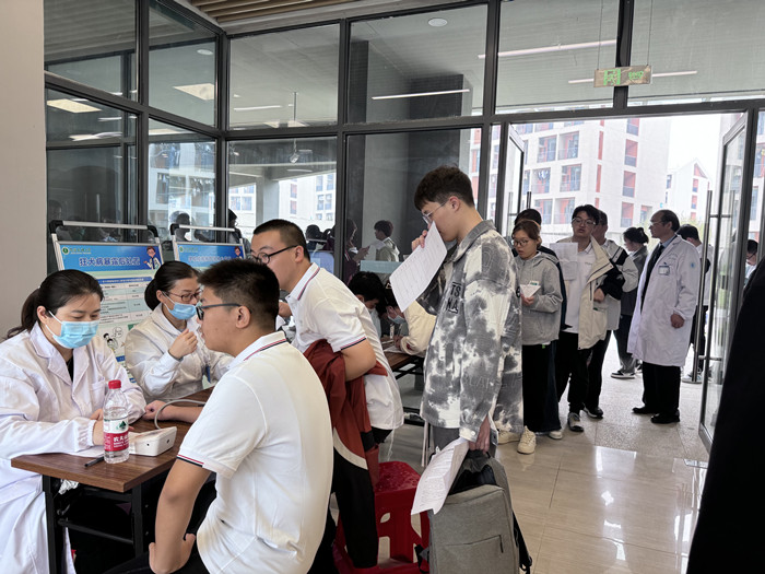 本次新生入学体检包含内科(含血压)、外科、视力、辨色、嗅觉、胸片、肝功能等项目,旨在全面了解学生健康状况,筛查传染病和既往病史,建立学生健康档案,加强学生自我保健意识,引导其养成良好的健康生活习惯。为保障体检工作有序开展,学院医院积极谋划做好统筹安排,制定应急预案,合理规划体检路线,布置场地、张贴指引标识,优化体检流程,分批次安排体检时间,并由专人进行疏导指引。新生体检期间,医务人员认真细致进行检查,受到新生一致好评。体检结束后,校医院及时上传体检报告,集中对体检数据进行全面分析汇总,指标异常人员按相关流程妥善处置。