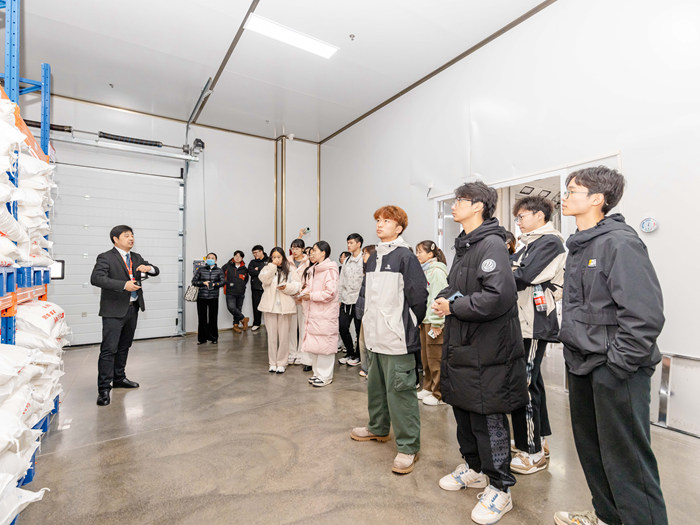 在企业厂房的参观通道,师生们通过可视化透明车间考察了高标准的风淋消毒间、先进的生产加工设备、食品检测实验室、物流运输云平台,目睹净菜、烤鸭、热卤、面点等食品的全自动流水线加工过程,了解冷藏保鲜库及肉制品冷冻库的工作原理,以及如何利用冷链物流运输实现从田间到车间再到舌尖的全程可追溯管理体系,深刻认识到新质生产力在食品预处理领域发挥的重要作用。