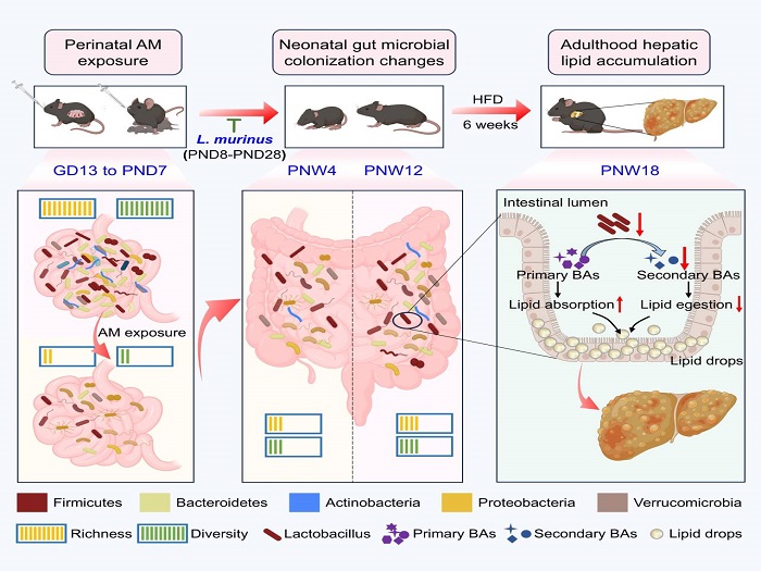 该研究利用围生期阿莫西林暴露构建生命早期肠道菌群定植改变小鼠模型,探究生命早期肠道菌群定植对成年期高脂饮食诱导MAFLD易感性的影响。结果显示,围生期抗生素暴露加剧高脂诱导雄性后代成年期肝脏脂质沉积并改变其肝脏脂质组成;围生期抗生素暴露不影响成年后代肝脏脂代谢相关基因表达,但通过抑制肠道胆汁酸代谢减少次级胆汁酸生成、促进脂质吸收。机制性探索发现,围产期抗生素暴露通过破坏生命早期肠道菌群定植永久性改变肠道菌群多样性。哺乳期补充乳酸杆菌可改善肠道菌群构成和胆汁酸代谢、减少脂质吸收并缓解高脂诱导肝脏脂质沉积。